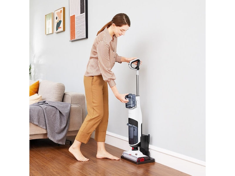 Dyprengjør hele gulvet, med et rengjøringsområde på opptil 280 m² på én enkelt lading3. Er baderomsgulvet vått etter en dusj? Du kan tørke opp det også. Med en dedikert Gulvtørkemodus.