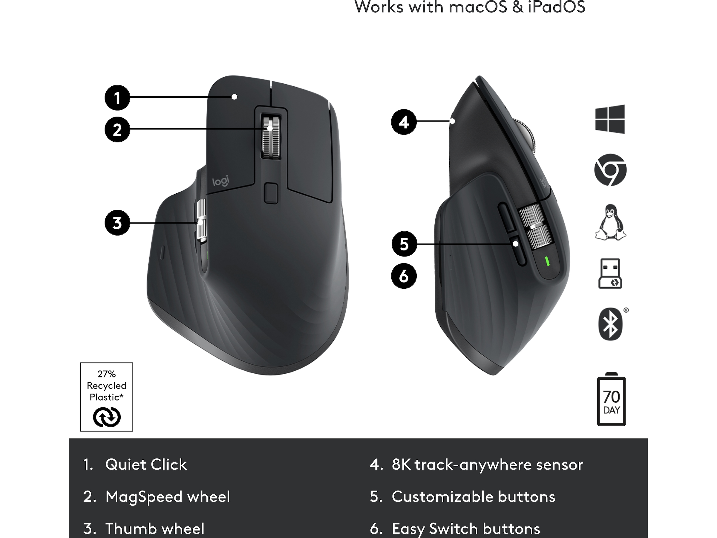 | Egenskaper | Tommelstøtte, Ladbart batteri, Håndbevegelsesfunksjon, Tommelhjul, Easy-Switch-teknologi, MagSpeed-hjul, Logitech Darkfield Laser Tracking, Quiet Clicks-teknologi, Tilpassbar DPI |