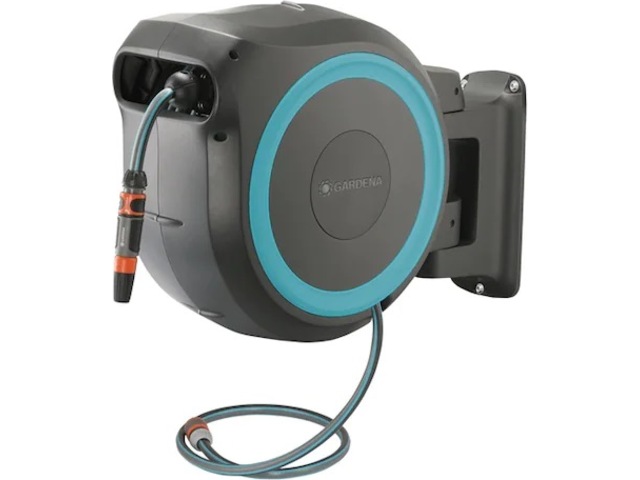 Deninnovative RollControl-teknologien gjør tilbaketrekkingen både trygg og kontrollert.Den integrerte slangeføringen sikrer at slangen rulles opp pent og jevnt, uten floker. Kranen og slangeforbindelsene på slangeboksen er en del av Original GARDENA System, slik at du når som helst kan koble til annet vanningstilbehør fra GARDENA. Munnstykket fra GARDENA er alltid lett tilgjengelig. Det kan festes under veggbraketten og oppbevares der for å spare plass.