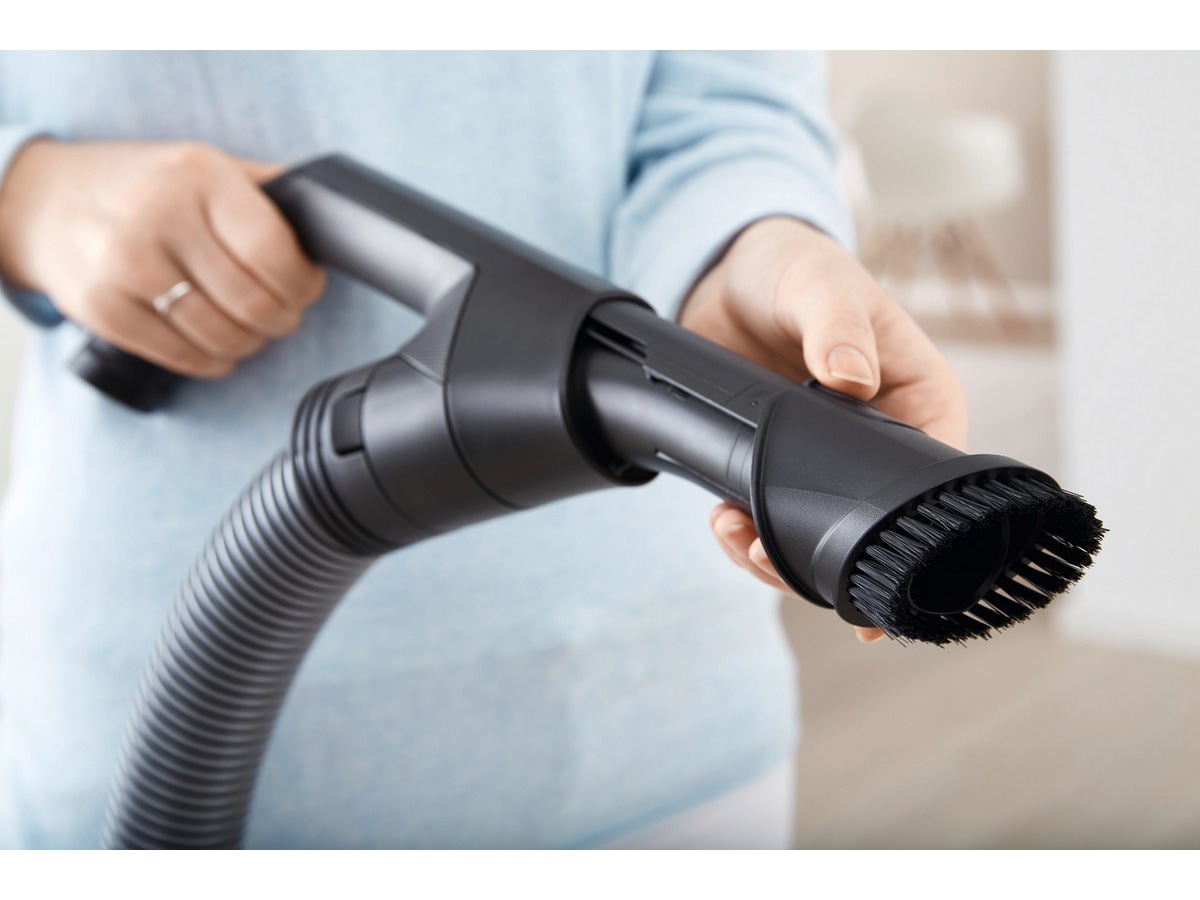 Kombinasjonen av kabel, støvsugerrør og slange gir deg en spesielt stor aksjonsradius. Dermed kan du enkelt støvsuge store rom uten å måtte bytte stikkontakt flere ganger.