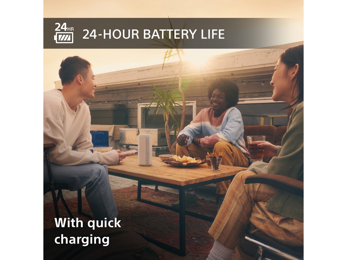 Takket være Sonys unike nye Line-Shape Diffuser-teknologi fordeles lyden jevnt, og når enda bredere og lengre. Dermed kan du og vennene dine nyte den samme kvalitetslydopplevelsen uansett hvor høyttaleren er i forhold til dere.
