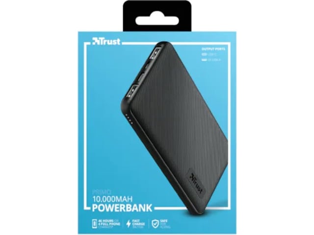 Nødladeren Trust Primo på 10 000 mAh er rask og smart: Leverer automatisk maksimal strøm til enhetene dine**. Du kan også raskt lade opp nødladeren med den medfølgende micro-USB-kabelen eller via USB-C-porten. Den smarte LED-nivåindikatoren på nødladeren gir deg beskjed når det er på tide å lade opp