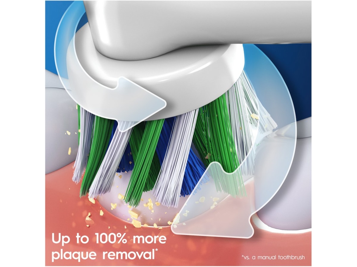 - Unik Oral-Bs 2D-rengjøringsteknologi: beveges frem og tilbake og roterer for opptil 100 % mer plakkfjerning sammenlignet med en manuell tannbørste