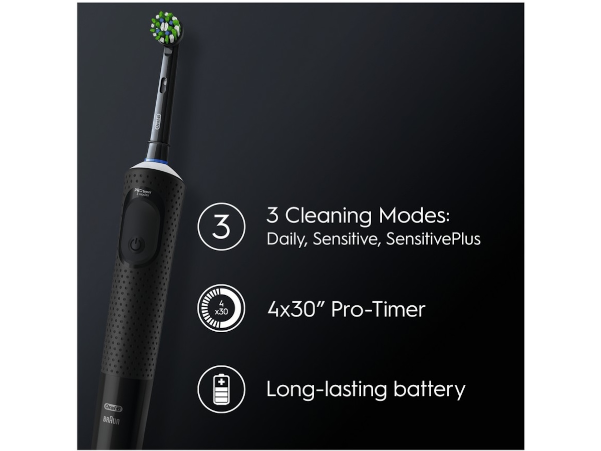 Tannbørsten har 3 pusseinnstillinger: daglig rengjøring, sensitiv og sensitiv pluss-innstilling for en utrolig skånsom opplevelse. En timer i håndtaket hjelper deg å pusse i 2 minutter slik tannlegen anbefaler. Og det beste av alt er at den leveres av Oral-B – varemerket som flest tannleger bruker verden over.