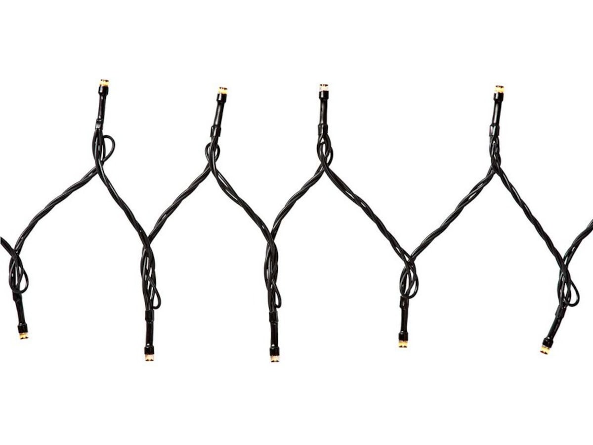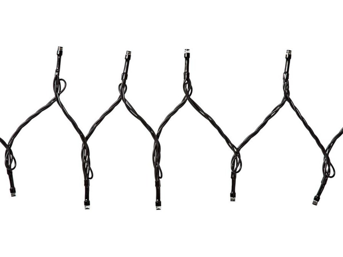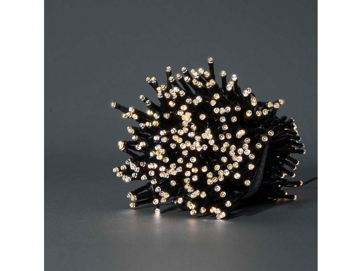 Den sorte fargen på kabelen passer fint inn i trær eller andre bakgrunner uten å være visuelt forstyrrende. Lyslenken på 20 meter har totalt 400 LED-lamper som er festet med 5 centimeter mellomrom. Med totalt 5 meter vil ikke strømledningen være for kort. Veldig bekvemmelig hvis stikkontakten er litt lenger unna. Lenken kan brukes både inne og ute.