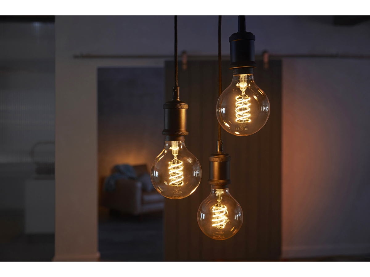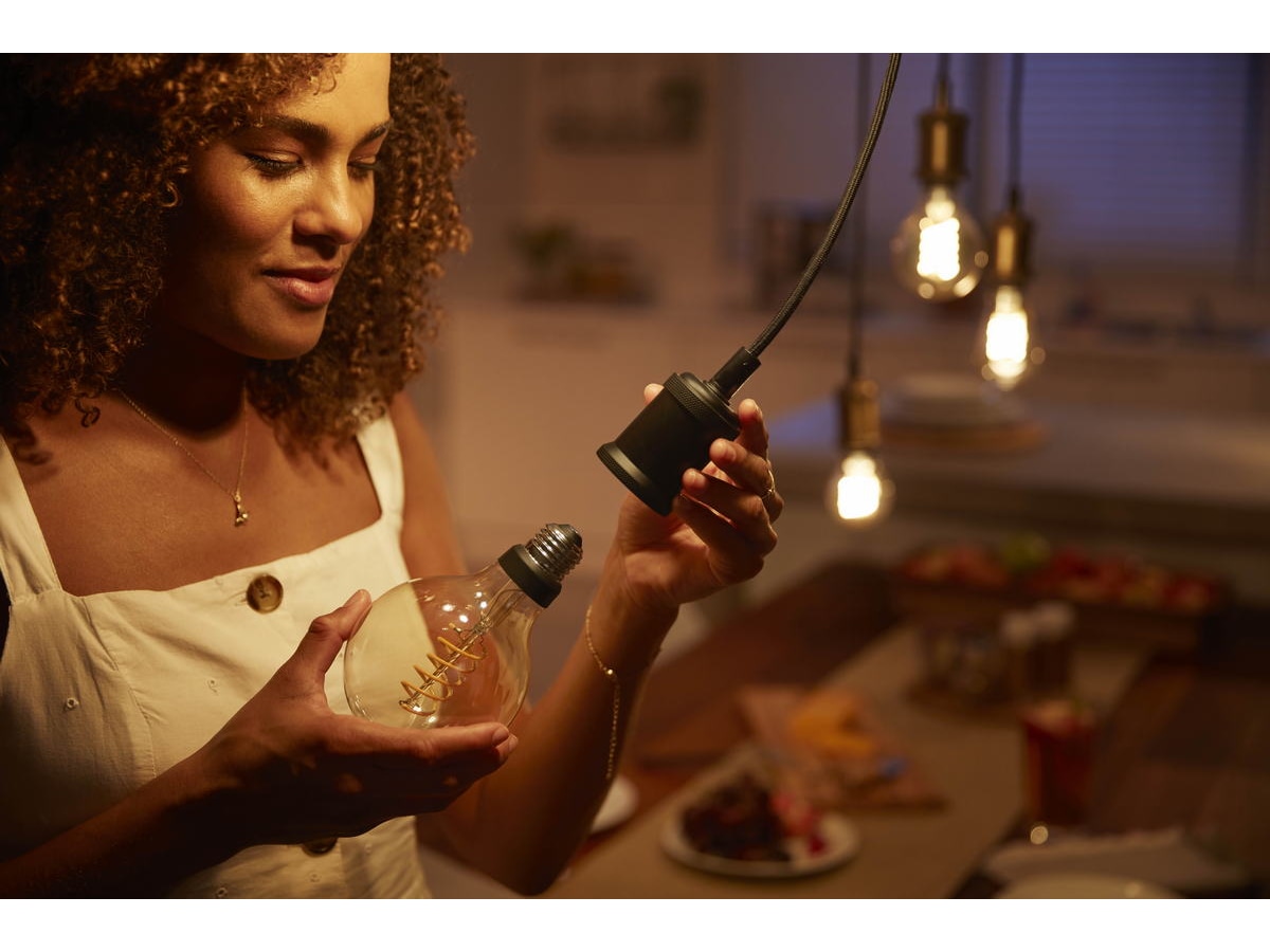 Philips Hue White glødelyskilde har gjennomsiktig glass med synlig filament-LED som skaper en koselig atmosfære rundt lyskilden.
