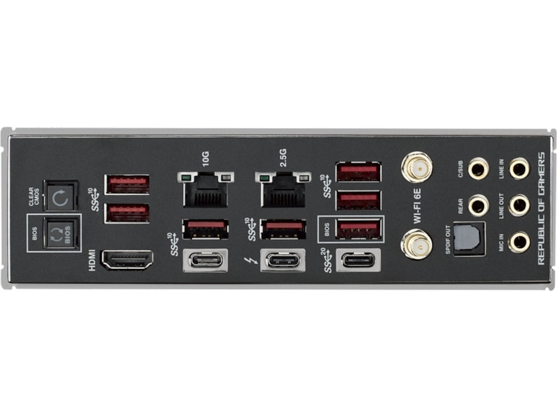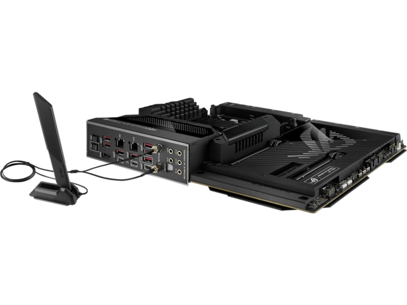 • Tilpasningsvennlig design: ROG Water Cooling Zone, PCIe Slot Q-Release, M.2 Q-Latch, forhåndsinstallert I/O-deksel, Q-Code, Q-LED, FlexKey-knapp, Start-knapp, BIOS FlashBack™-knapp og Clear CMOS-knapp