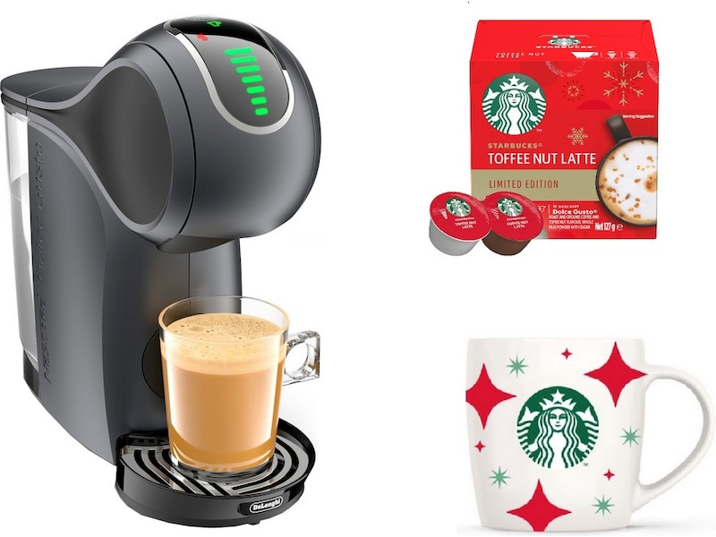 Eksklusive STARBUCKS Holiday Bundle Pack fra NESCAFÉ Dolce Gusto inneholder en Genio S Touch kapselmaskin + en eske STARBUCKS Toffee Nut Latte + en gratis gave – det ikoniske STARBUCKS-kruset.