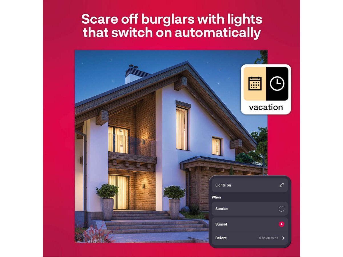 Og hvis du kommer hjem litt senere i løpet av en vanlig uke i den mørke årstiden, kan du slå på lysene eksternt. På denne måten kommer du hjem til et mer behagelig hjem og unngår samtidig ubudne gjester.