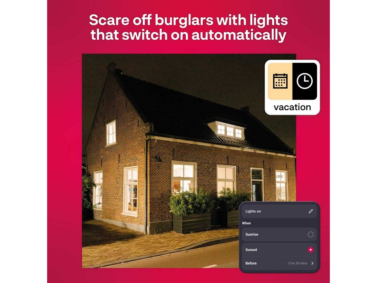 Når du er borte hjemmefra eller på ferie i den mørke årstiden, kan du enkelt simulere at du er hjemme. Innbruddstyver er ofte impulsive og tør ikke ta en for stor risiko, så et mørkt hus er mer attraktivt. Tidligere kunne man gjøre dette med tidsbrytere, men smart belysning lar deg gjøre det mye enklere, uansett hvor du er.
