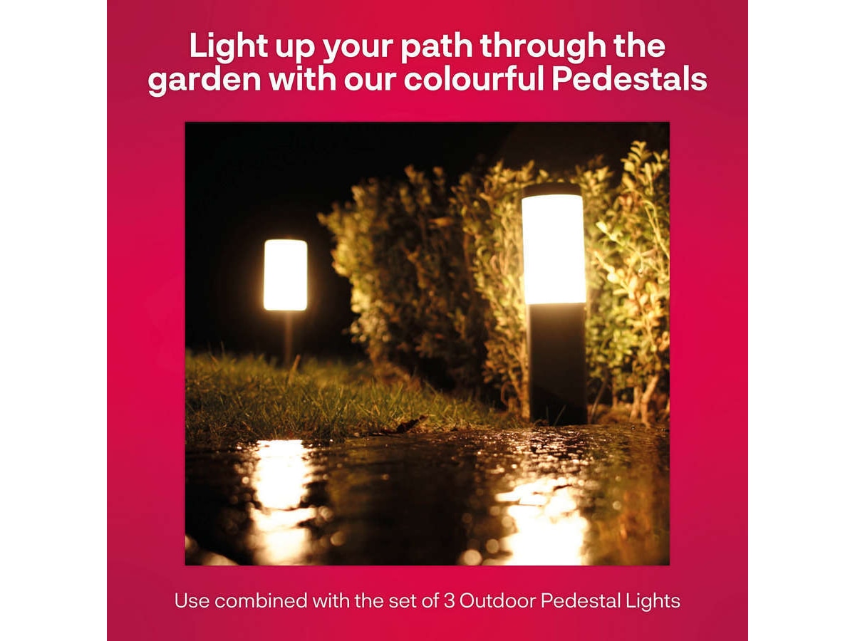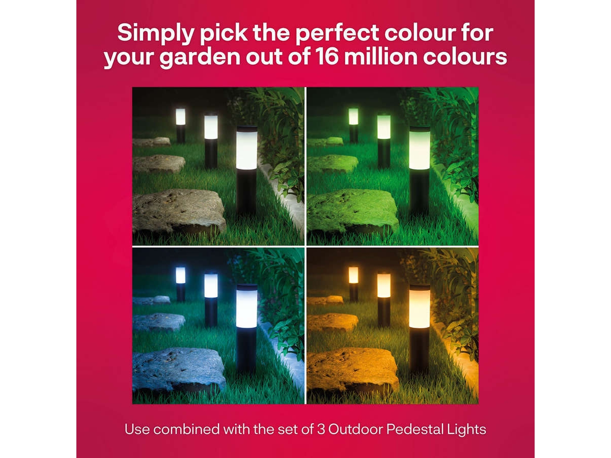 Sett sokkellysene ned i gresset eller mellom plantene for stemningsskapende, dekorative aksenter. Ved siden av stien eller terrassen gir sokkellysene et vakkert og funksjonelt spredt lys. Med denne utendørsbelysningen kan du ved hjelp av appen velge varmhvitt lys for ekstra stemning eller gi ekstra farge til eksteriøret ditt med en av de 16 millioner lysfargene.