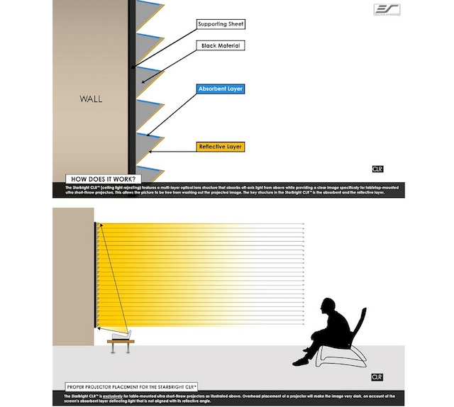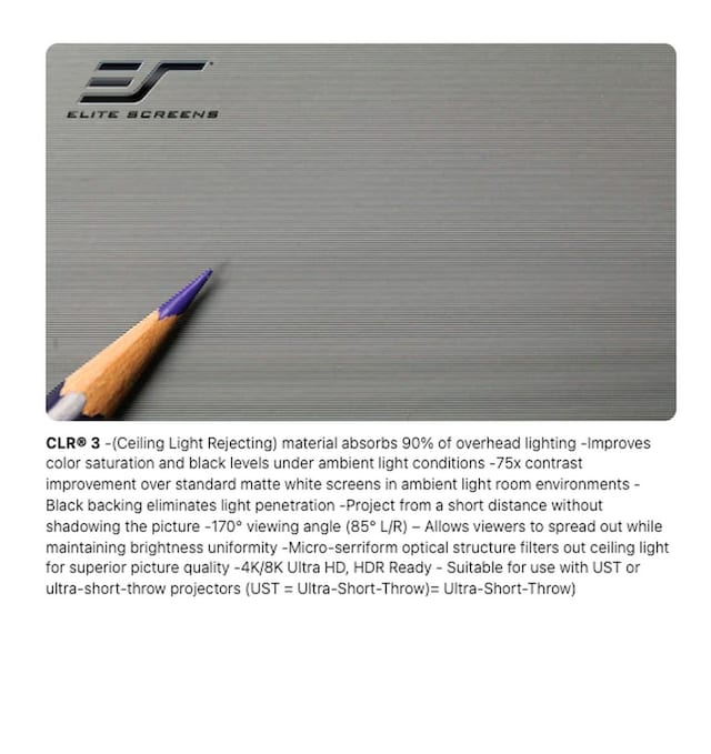 - Materialet i CLR® 3 (Ceiling Light Rejecting) absorberer 90 % av belysningen over lerretet