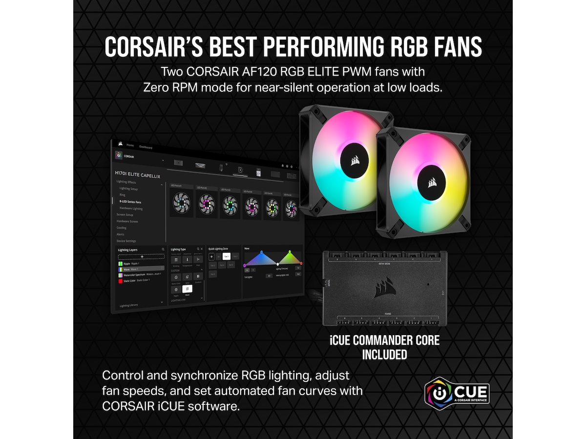 En medfølgende iCUE COMMANDER CORE RGB-belysning og viftehastighetsregulator gir deg presis hastighet og lysstyring over opptil seks RGB-vifter.