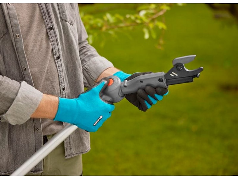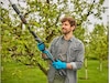 Batteridrevet teleskopstangsaks 250/18V P4A i komplett sett fra GARDENA hjelper deg med enkelt å beskjære på høye høyder fra bakken. Teleskopstangen når en lengde på opptil 2,5 meter og lar deg nå totalt opptil 4 meter under beskjæring. Takket være det avtakbare skaftet er teleskopstangen enkel å transportere og oppbevare.