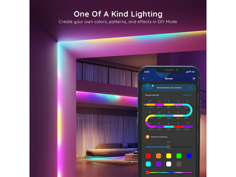 - RGBIC-teknologi: Juster flere farger på én enkelt lyslist