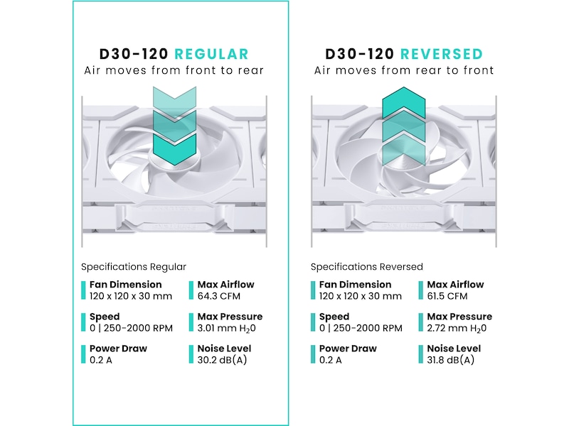 • Tilgjengelige modeller med vanlig og omvendt luftstrøm: Med modeller med vanlig og omvendt luftstrøm tilgjengelig, muliggjør D30-viften den perfekte konfigurasjonen uten å hindre viftebladets belysningseffekt.
