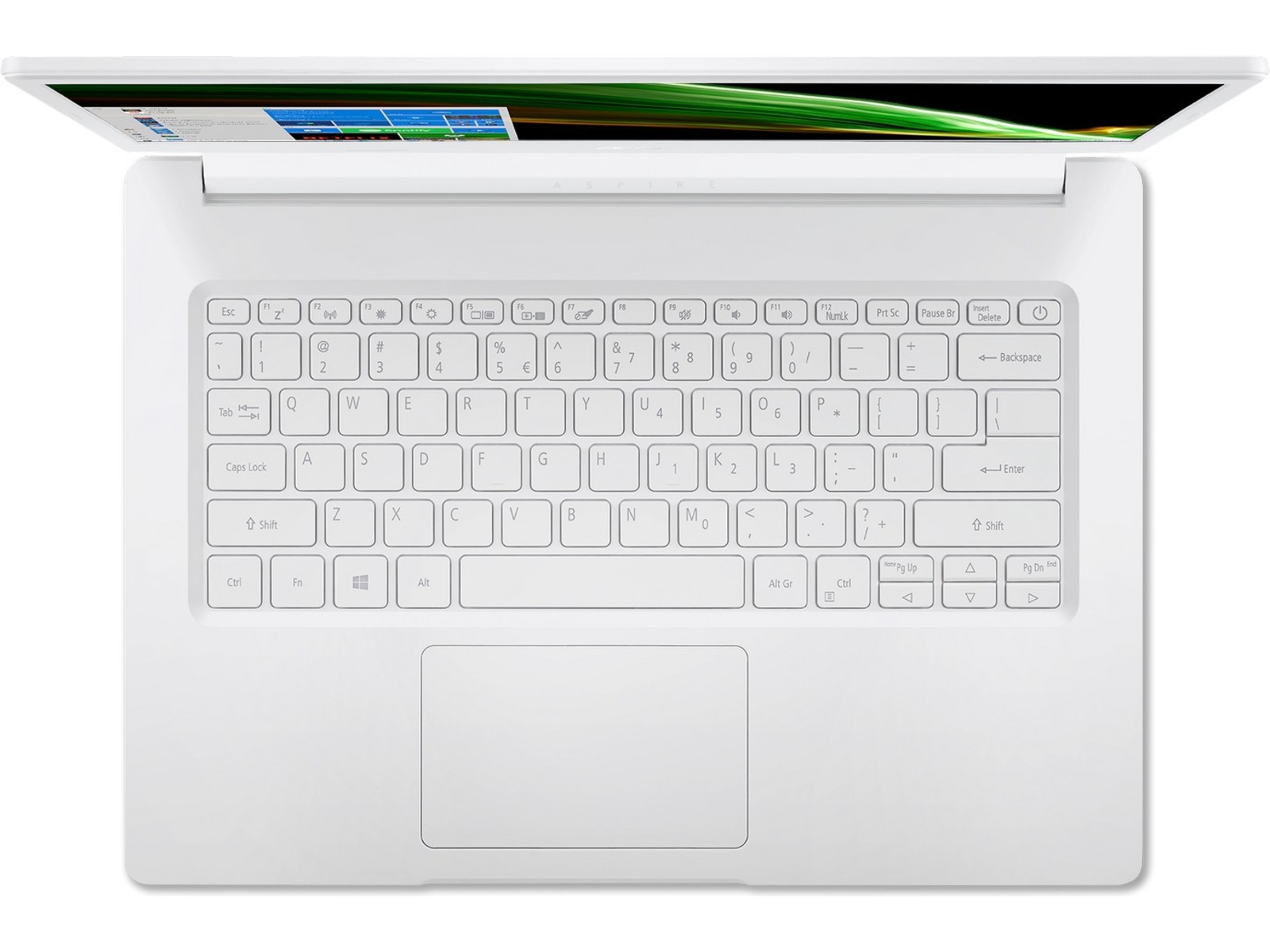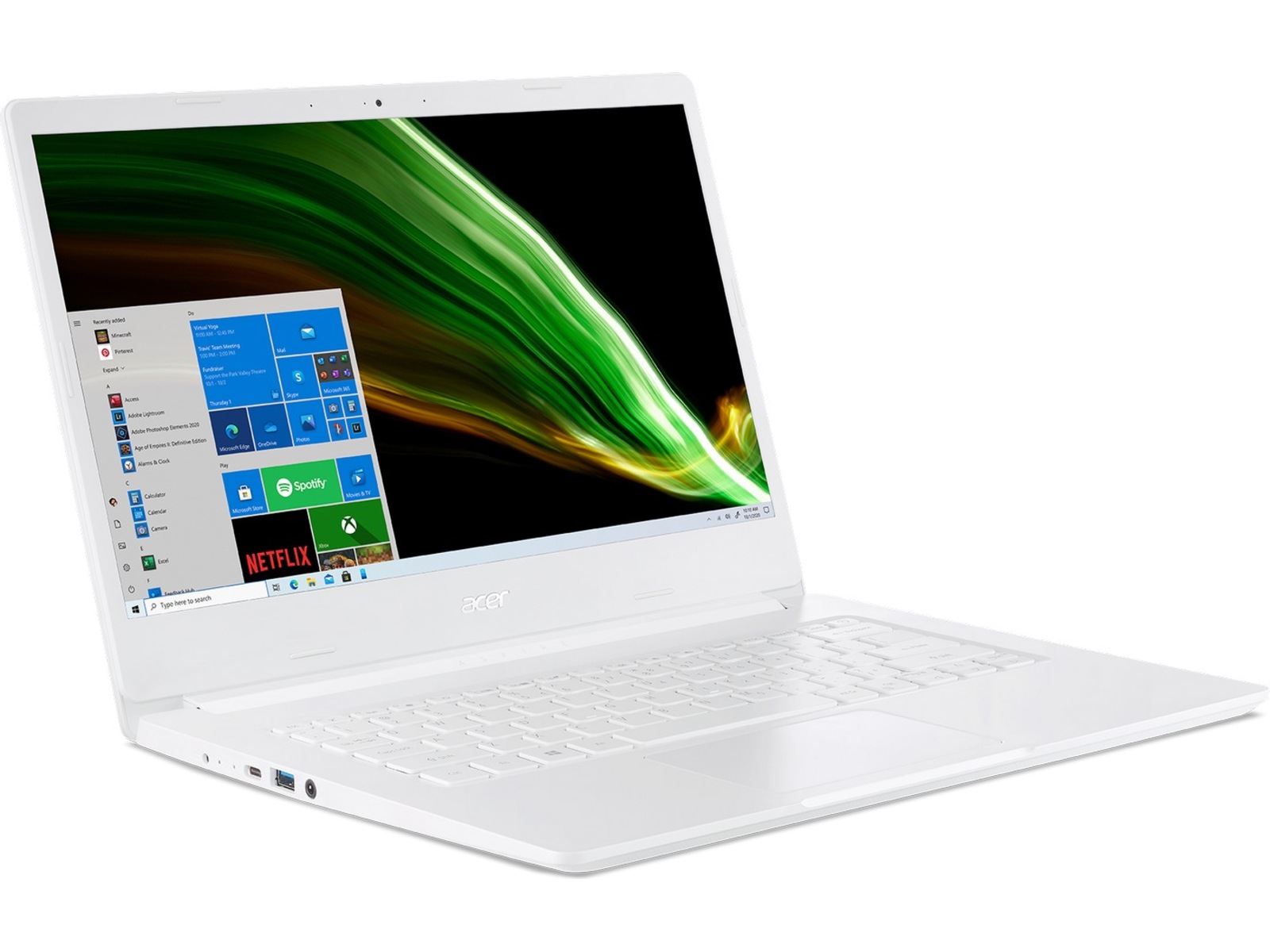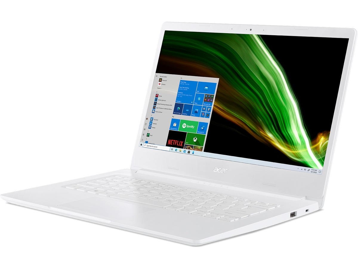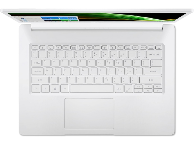 Denne Aspire 1 er laget for å være praktisk å bruke på farten. Denne lette enheten er omgitt av et perlehvitt deksel, og på innsiden finner vi en Qualcomm® Snapdragon'" 7c Compute Platform-prosessor og nok batteri for en hel dags bruk.