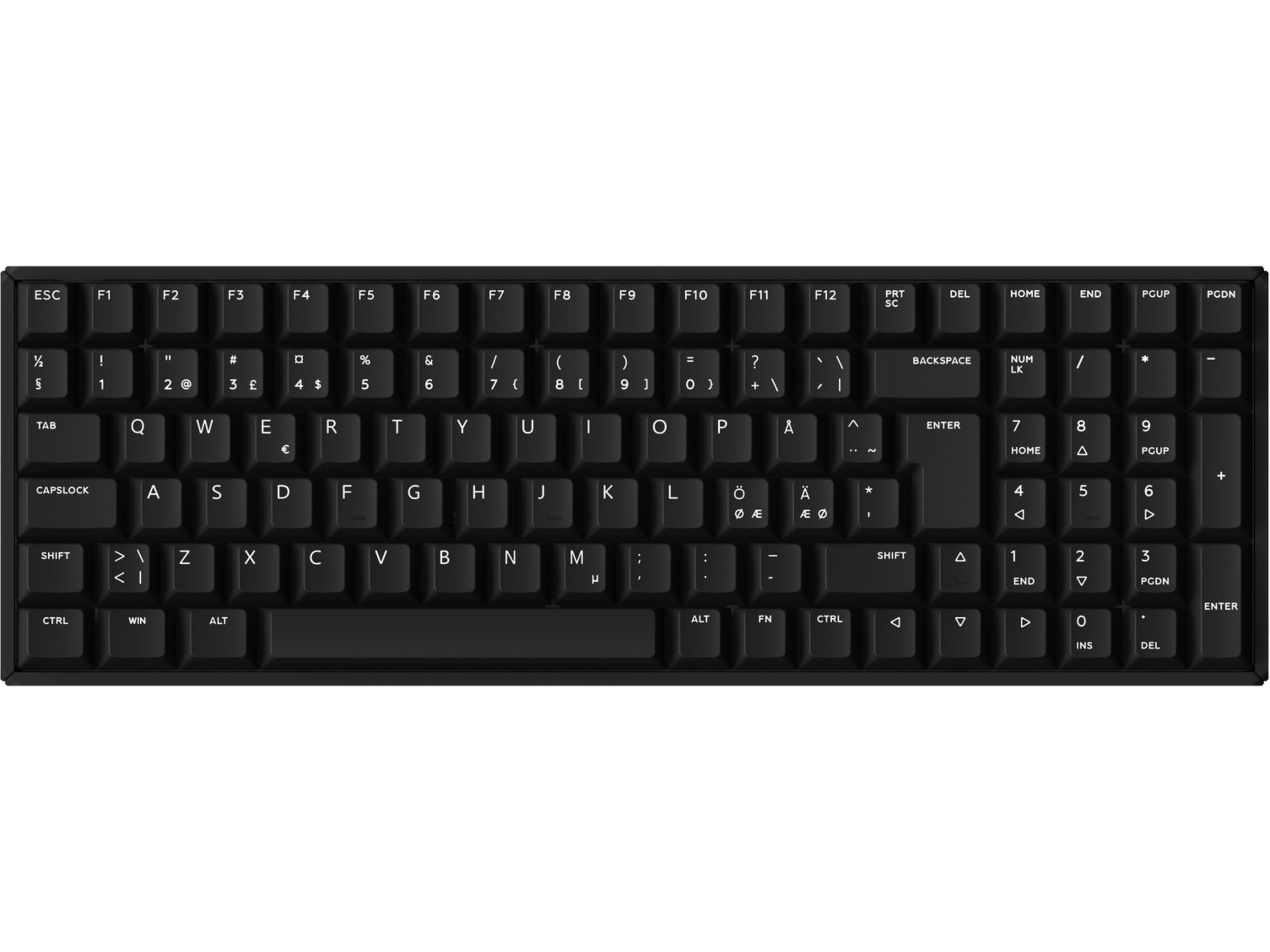 Kompakt oppsett med 100 taster. Det er et tastatur i «full størrelse» som inneholder et nummertastatur, men som frigjør bordplass.