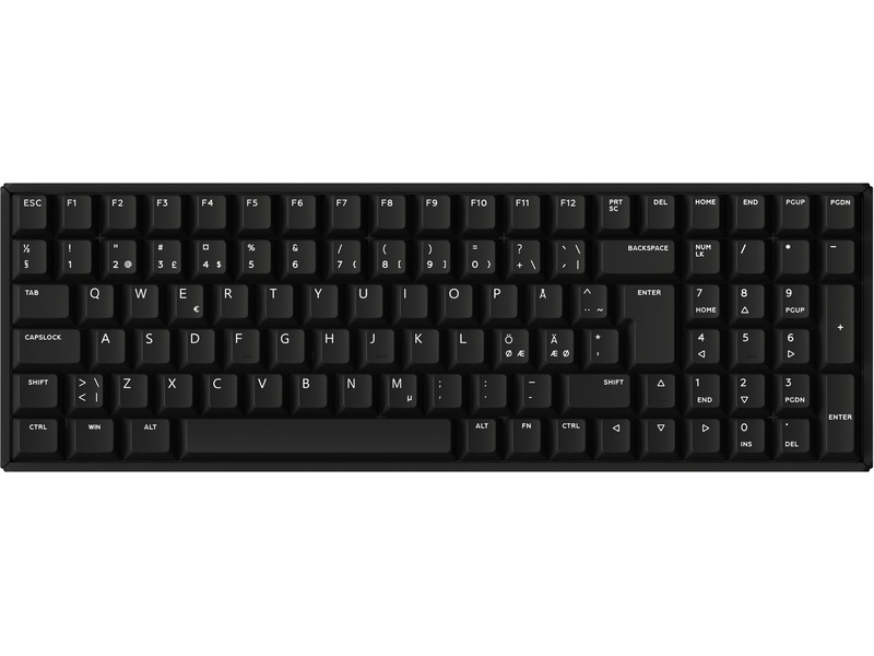 Kompakt oppsett med 100 taster. Det er et tastatur i «full størrelse» som inneholder et nummertastatur, men som frigjør bordplass.