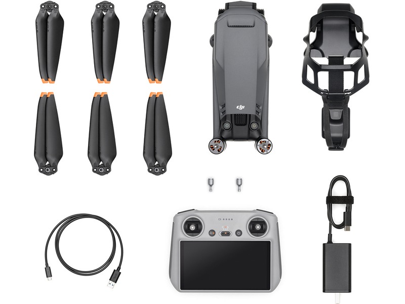 Pakkeinnhold Et par ekstra kontrollpinner, Bærbar lader (65 W), Kommunikasjonskabel (USB 3.0 type-C), DJI RC-fjernkontroll, 3 par lavstøyspropeller, Lagerdeksel, Intelligent flybatteri