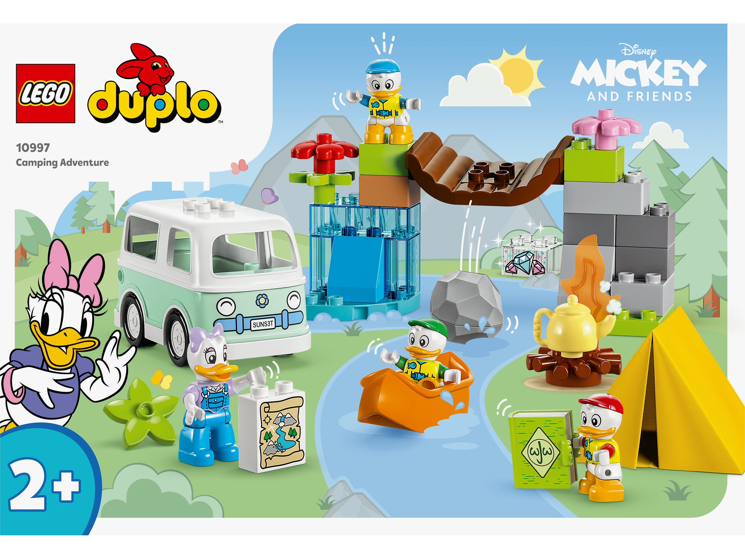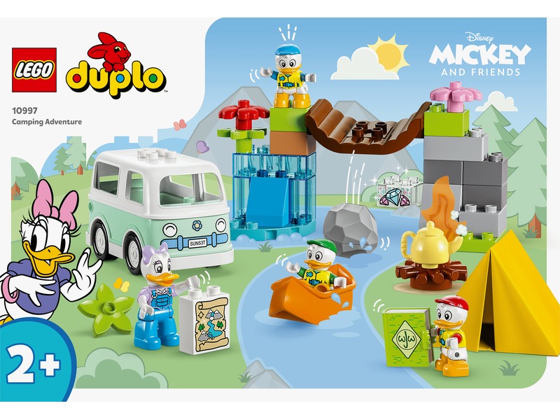 Med settet LEGO® DUPLO® ǀ Disney LEGO® DUPLO® ǀ Disney Mikke og venner Campingeventyr (10997) får barn timevis med gøyal læring. Det morsomme byggesettet med Disneys Dolly Duck og nevøene hennes byr på mange kreative og actionfylte campingaktiviteter som lærer barn fra to år om utholdenhet og samarbeid. Byggbart lekesett som stimulerer fantasien Smårollinger kan dra på eventyr utendørs med Dolly Duck samt Ole, Dole og Doffen i en kjørbar campingbil. De finner et skattekart og må navigere en kano på elven og passere under en vinglete bro med en kampestein som kan trille ned i vannet. Vel forbi finner de skatten bak et byggbart fossefall, og etterpå bygger de seg et leirbål før de legger seg i teltet for kvelden. Nyttige livsferdigheter Med denne pedagogiske byggeleken utvikler små barn sine finmotoriske ferdigheter. Etterpå kan de delta i familiebasert rollelek med foreldrene sine, hvor de lærer å være empatiske, uttrykke seg og samarbeide – alt sammen viktige milepæler i barns utvikling.