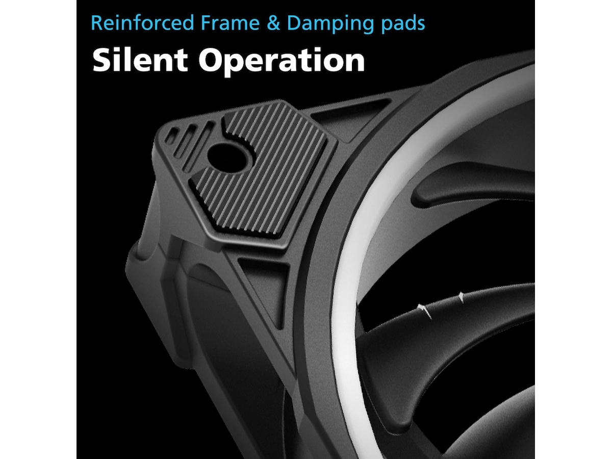 Forsterket ramme gir stivhet og skriker førsteklasses. Den er funksjonell og reduserer turbulens og støy . Paret med diskrete vibrasjonsdempende fester festet til hvert hjørne av viften minimerer driftsstøy og overføring av vibrasjoner til PC-kabinettet og andre komponenter, og holder støyen i sjakk.