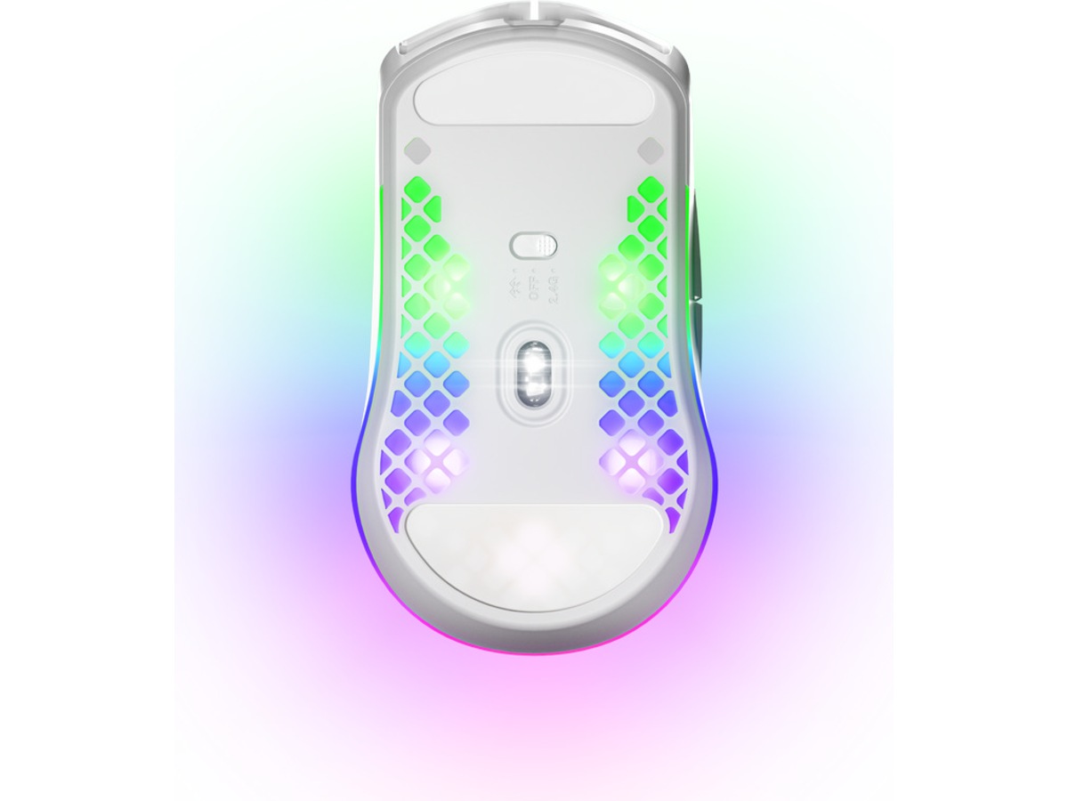 | Egenskaper | Hurtiglading, Zero Hardware Acceleration, Quantum 2.0 Wireless-teknologi, SteelSeries TrueMove Air-sensor, Holey Shell, AquaBarrier Protection, Golden Micro IP54 mekaniske brytere, Ladbart batteri, 3 RGB-soner, Polytetrafluoretylen (PTFE)-føtter |