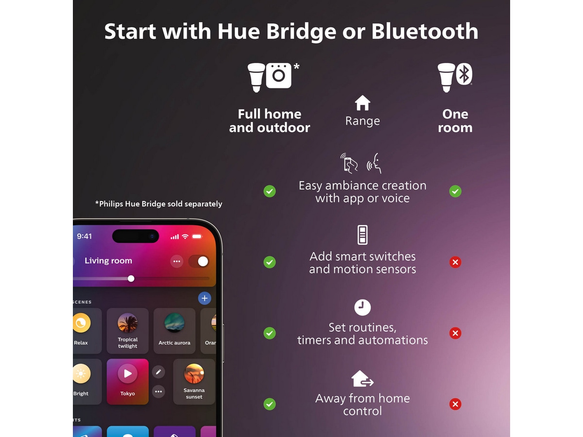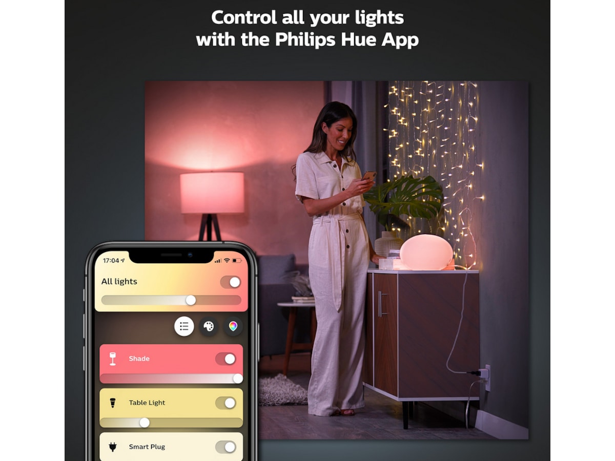 Med dette lille, uanselige tilbehøret kan du forvandle alle lamper – også de du ikke kan bruke Hue-lyskilder i – til smarte lamper som kan du kan styre med stemmen eller Hue-appen. Styr lyset direkte via Bluetooth i ett rom, eller koble til Hue Bridge for å få tilgang til samtlige funksjoner.