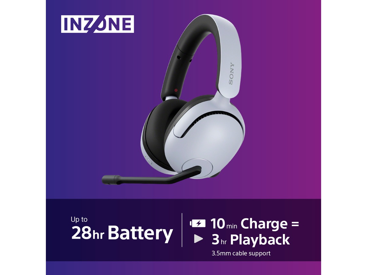 Med opptil 28 timers uavbrutt spilletid, holder INZONE H5 så lenge du har behov for det. Med tre timers spilletid etter bare 10 minutters lading, kan du være tilbake for fullt etter en liten pause.På vei til å gå tom for strøm? Lad hodetelefonene med den medfølgende USB-kabelen og bli værende i kampen.