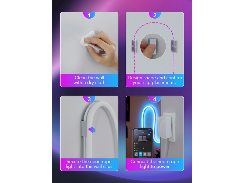 Funksjoner Talestyring, Appstyrt, Dynamisk segmentert farge, Innendørs-/utendørsbruk, Bøyelig tau, Vannbestandig, 11 musikkmoduser, 64+ forhåndsinnstilte scenemoduser
