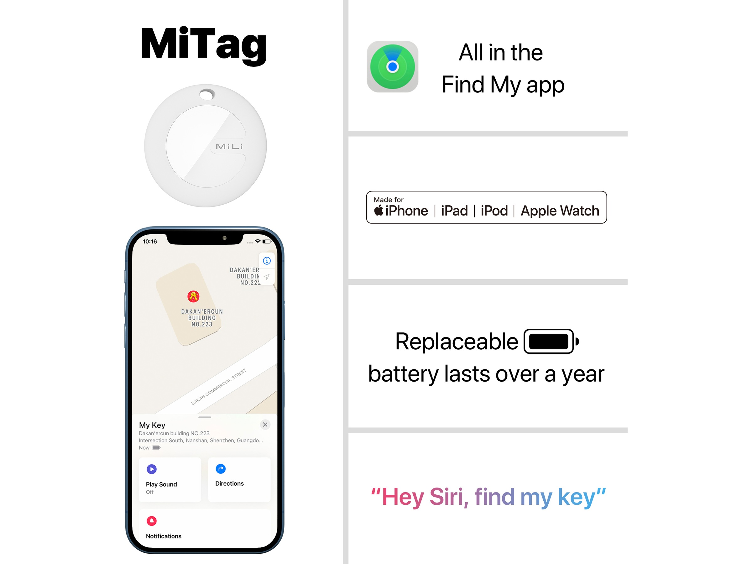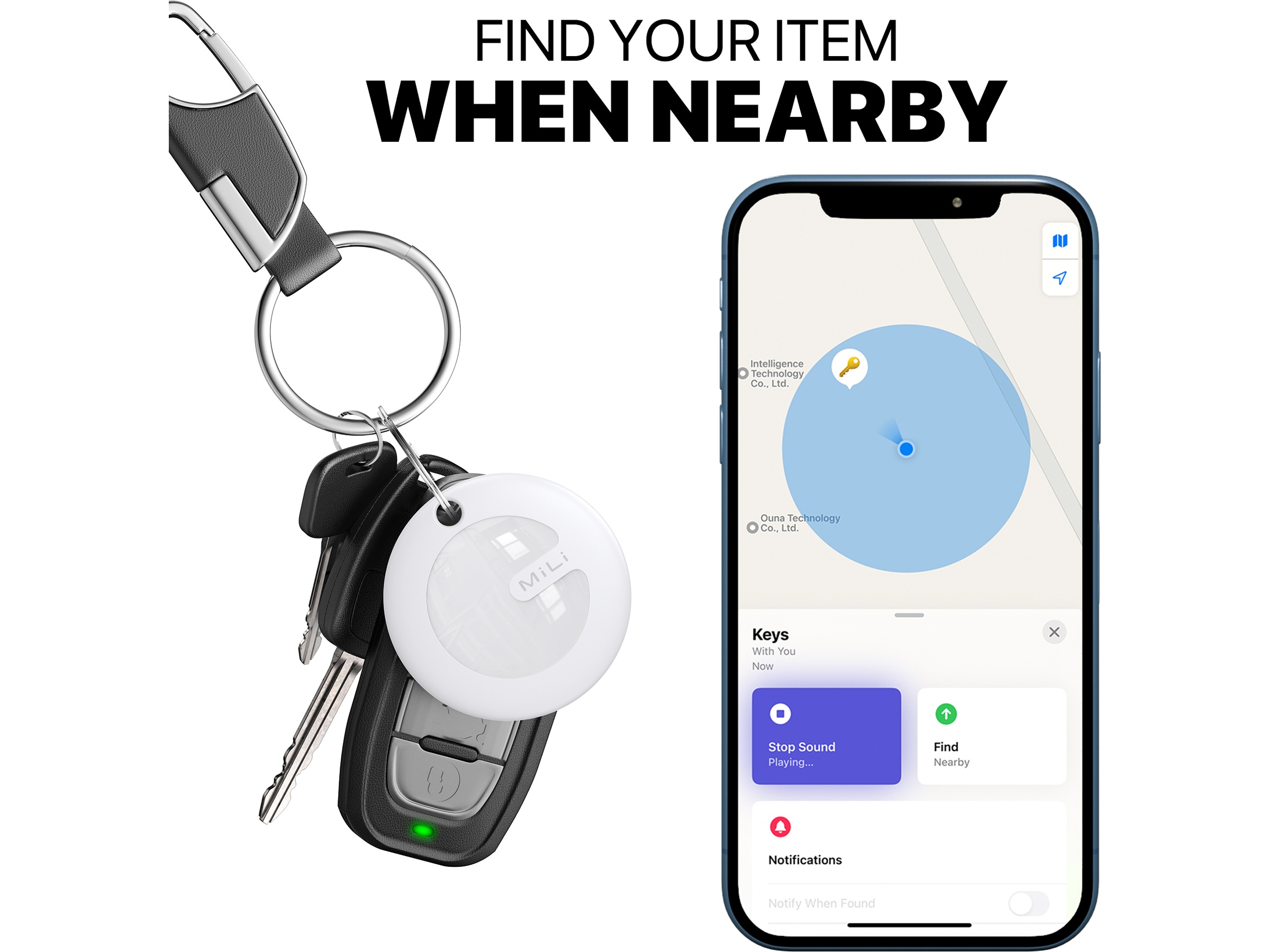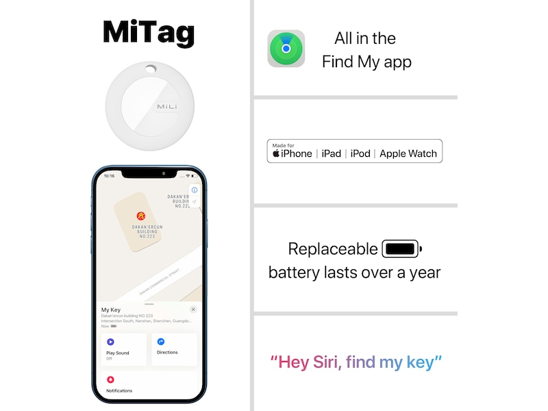 MiLi MiTag er en Apple MFi-sertifisert Bluetooth-søker som, takket være hundrevis av millioner av Apple-enheter over hele verden og avansert sikker ende-til-ende-kryptering, lar deg enkelt finne dine personlige eiendeler ved hjelp av Finn min-appen mens du respekterer personvernet ditt fullt ut.