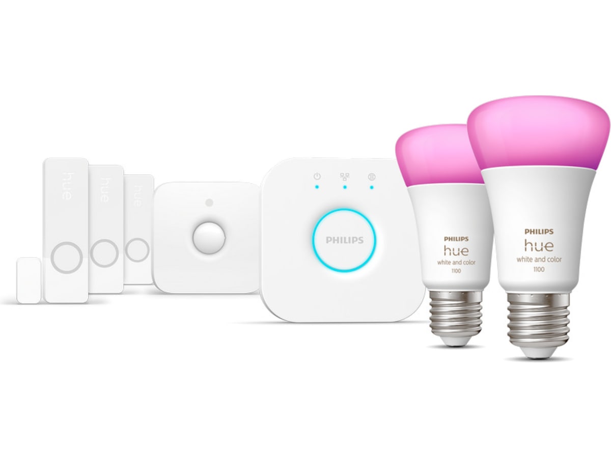 Kom i gang med Smart home security ved hjelp av dette Secure-startsettet som inkluderer tre Secure-kontaktsensorer i hvitt, én bevegelsessensor, to White and color ambiance E27-lyspærer og en Hue Bridge.