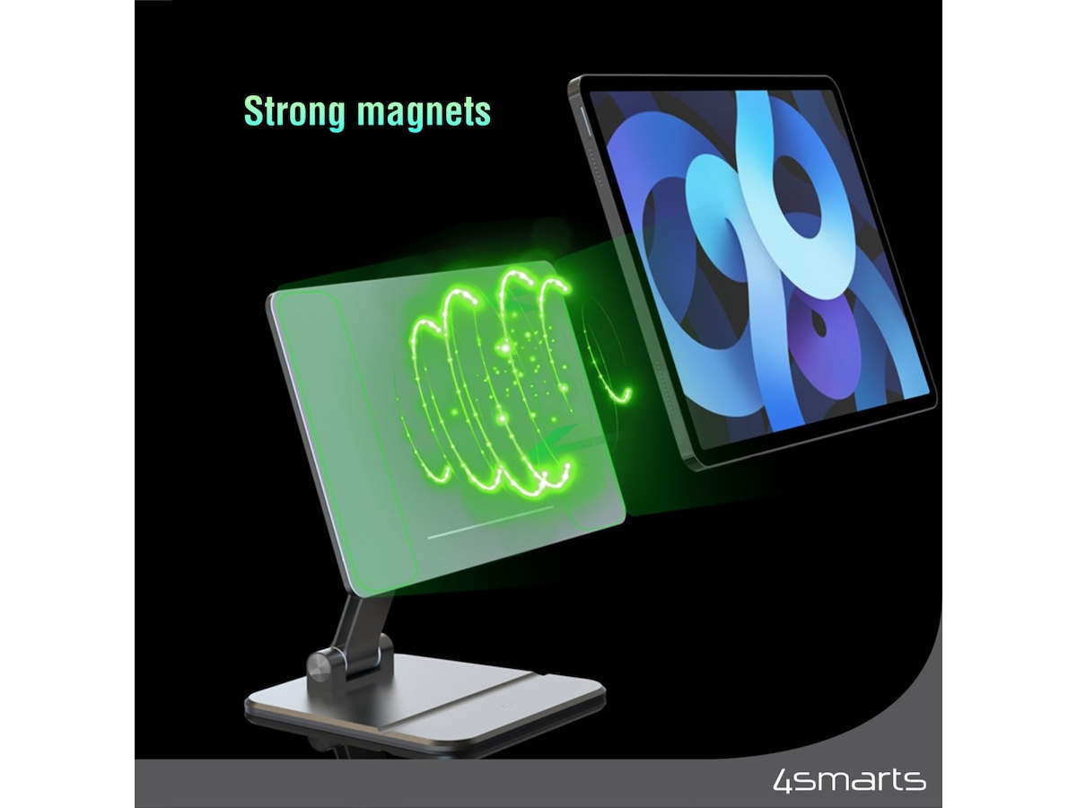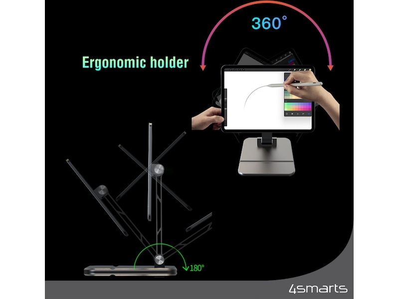 Festet tillater 360 graders rotasjon for å feste iPad-en din både horisontalt og vertikalt. Denne fleksibiliteten lar deg justere iPad-en til en hvilken som helst posisjon for en optimal brukeropplevelse. Dekselet til nettbrettholderen er sammenleggbart, noe som gjør den egnet for mobil bruk. Den kan enkelt legges sammen og oppbevares i en veske eller skuff. Så du kan ta holderen med deg hvor som helst, og holde iPad-en trygg og stabil til enhver tid. Vår 4smarts-holder er en ideell løsning for å bruke iPad-en din komfortabelt og trygt. Den gir muligheten til å justere svingarmen opp til 180 grader for å plassere iPad-en i høyden optimalt.