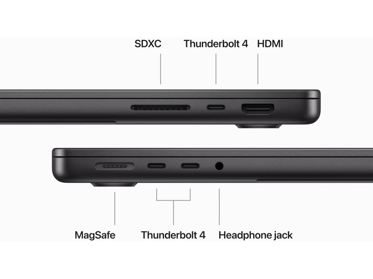 - KOBLE TIL ALT – Denne MacBook Pro har MagSafe-ladeport, tre Thunderbolt 4-porter, en SDXC-kortplass, en HDMI-port og en hodetelefonutgang. Få rask trådløs tilkobling med WiFi 6E (5) og Bluetooth 5.3. Og du kan koble til opptil to eksterne skjermer med M3 Pro, eller opptil fire med M3 Max.