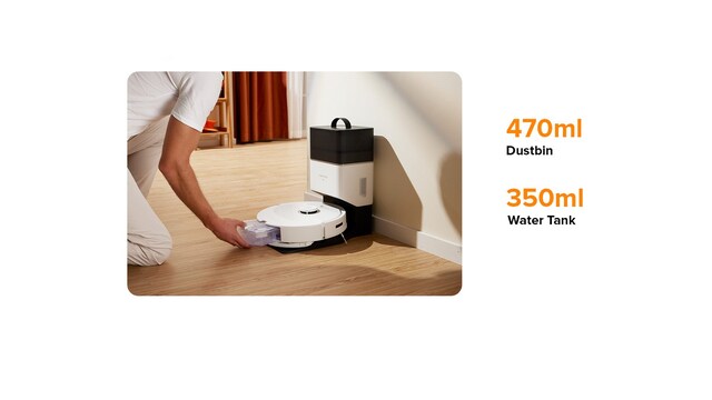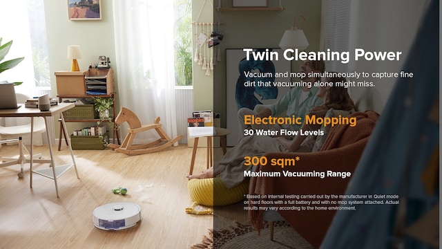 *Basert på interne tester utført av produsenten i stillegående modus på harde gulv med fullt batteri og uten tilkoblet moppesystem. Faktiske resultater kan variere avhengig av hjemmemiljøet.