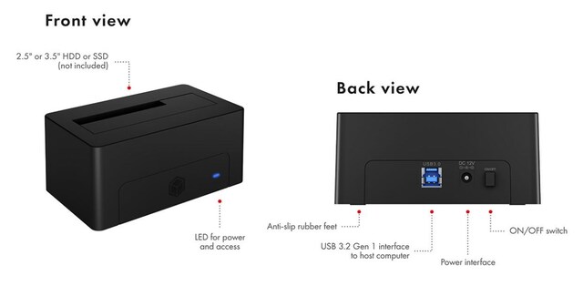 Den doble brønnen i kabinettet godtar raskt og enkelt en 2,5 eller 3,5" SATA I/II/III SSD eller HDD og kan brukes umiddelbart som et eksternt lagringsmedium. På grunn av enkel innsetting og innsetting av harddisker, er vekslingen en barnelek og krever ingen verktøy.