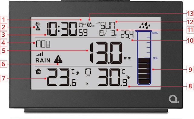 Hvis du har over gjennomsnittet interesse for nedbør og vær, passer Anderssons digitale regnmåler perfekt for deg. På det store LCD-displayet på innendørsenheten kan du se tid, dato, ukedag og aktuell temperatur både inne og ute. Du kan også få informasjon om nedbørmengden i åtte ulike innstillinger ved å trykke på RAIN/ALERT-knappen på baksiden: