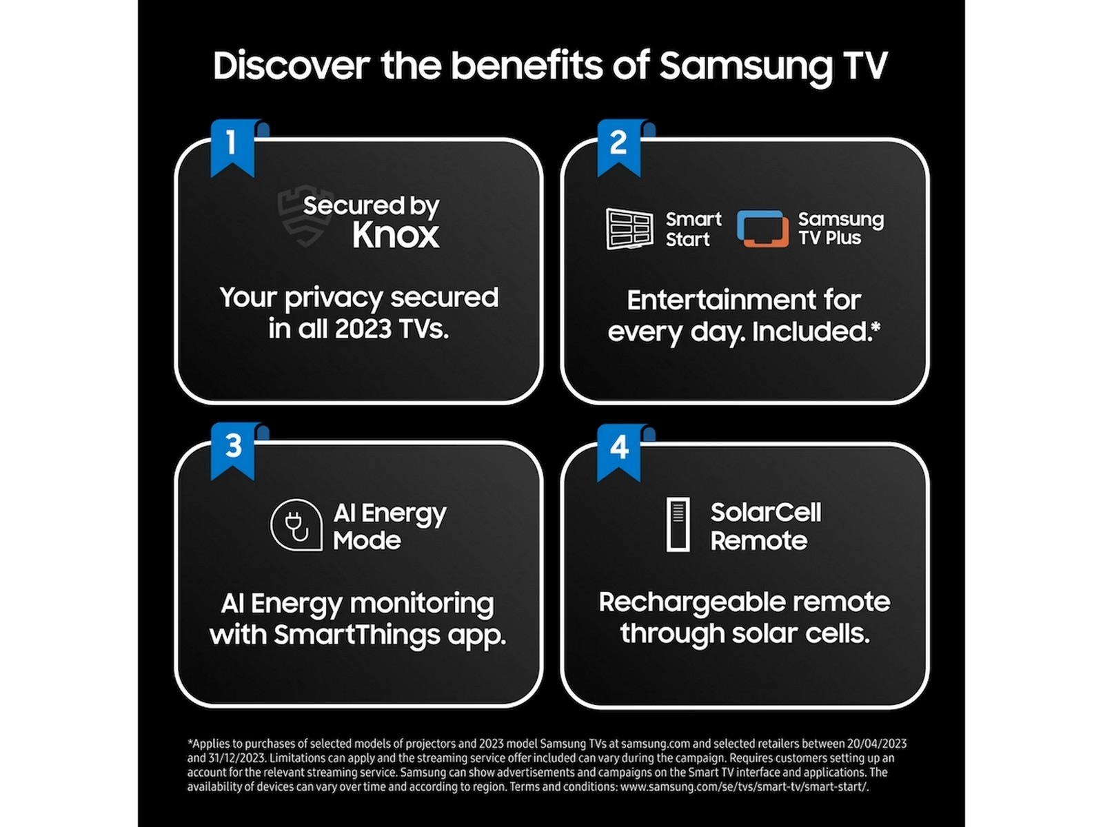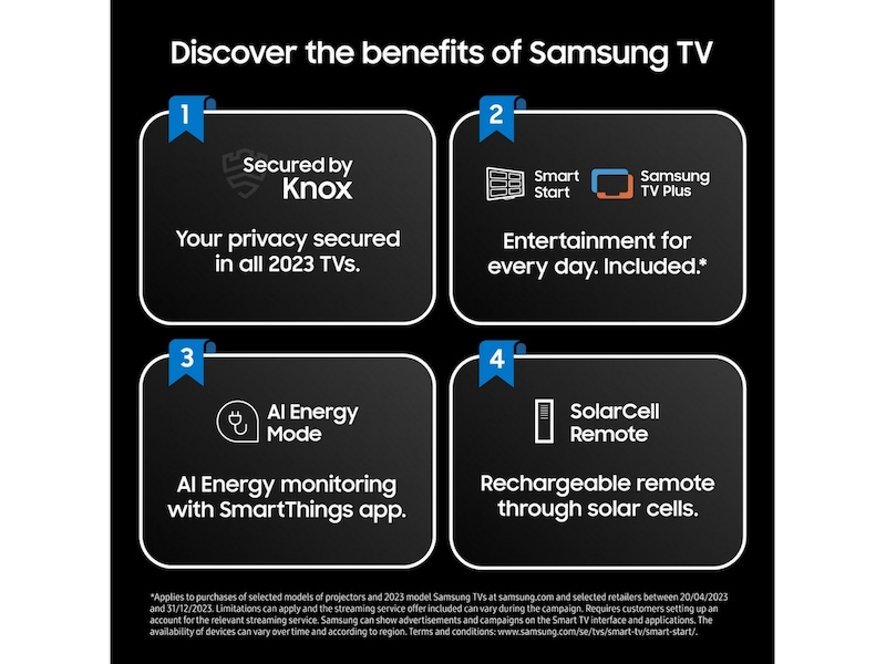 *Gjelder ved kjøp av utvalgte 2023 Samsung TV hos Samsung.com samt utvalgte forhandlere. Garantien gjelder i 10 år fra kjøpsdato. Krever en kopi av kvittering samt registrering på Samsungs nettsted innen 90 dager etter kjøp. Gjelder ved kjøp av utvalgte TV-modeller for 2023 til og med 31. mars 2024.