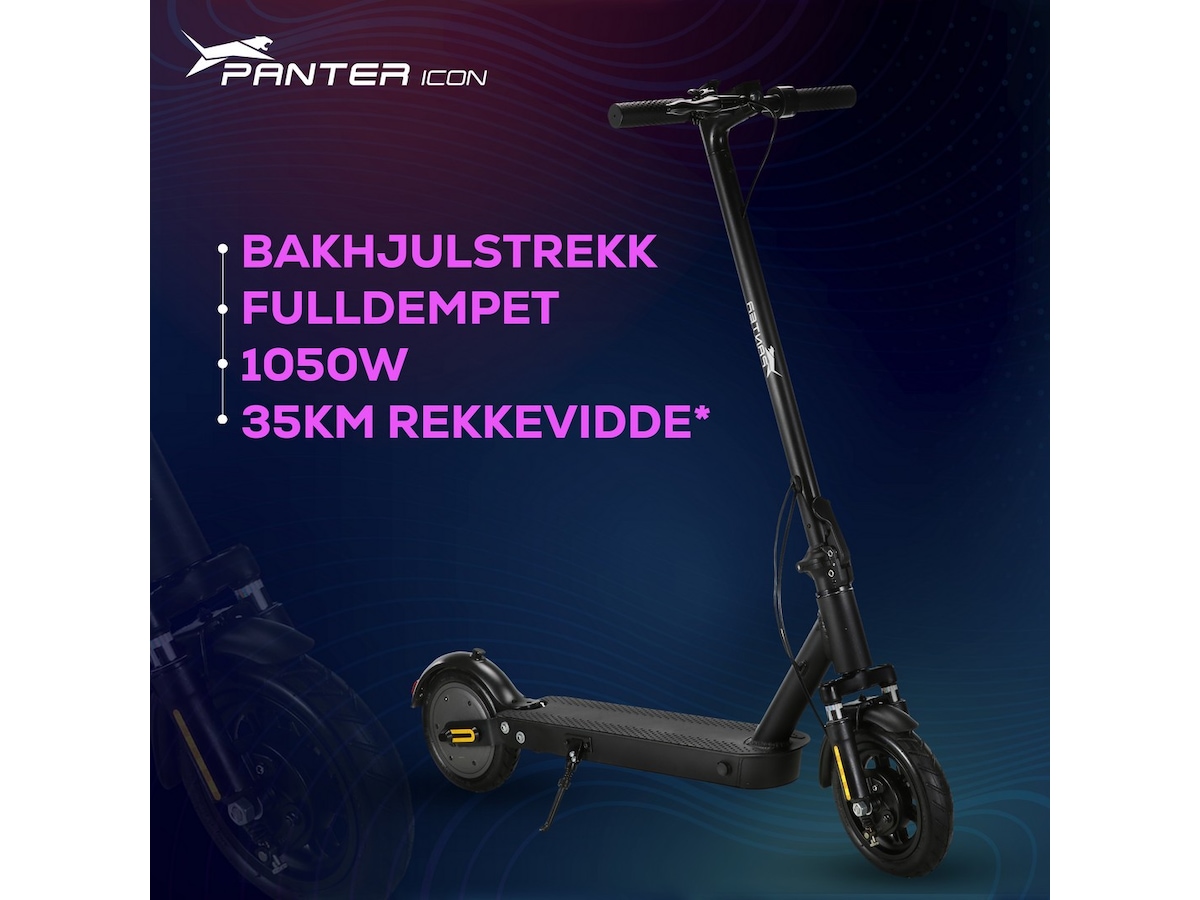 Panter Icon kombinerer kraft og kjørekomfort i en lett og kompakt el-sparkesykkel. Bakhjulstrekk og fulldemping er sjelden vare i denne prisklassen - men denne kommer med begge deler. Motoren har høyt dreiemoment som trekker deg opp i god fart selv i bakker.