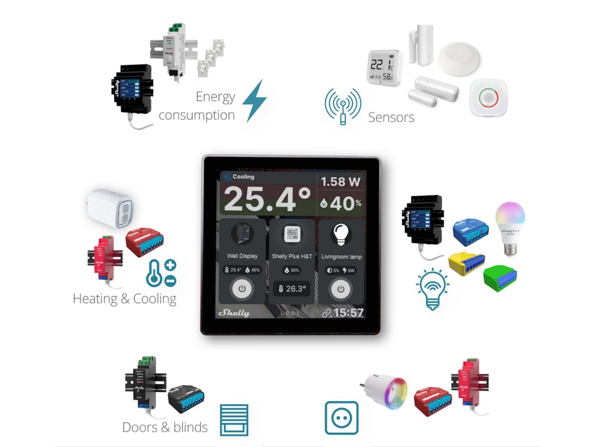 Shelly Wall Display er en intuitiv 4" veggdisplay som gir deg enkel, sentralisert kontroll og overvåkning av alle Shelly-enhetene dine. Med et minimalistisk utseende og tilpassbar startskjerm, vil Shelly Wall Display passe perfekt inn i interiøret ditt og justere seg etter dine behov. Bytt ut den vanlige lysbryteren på 10 minutter og betjen alle Shelly-enhetene dine med bare ett trykk.