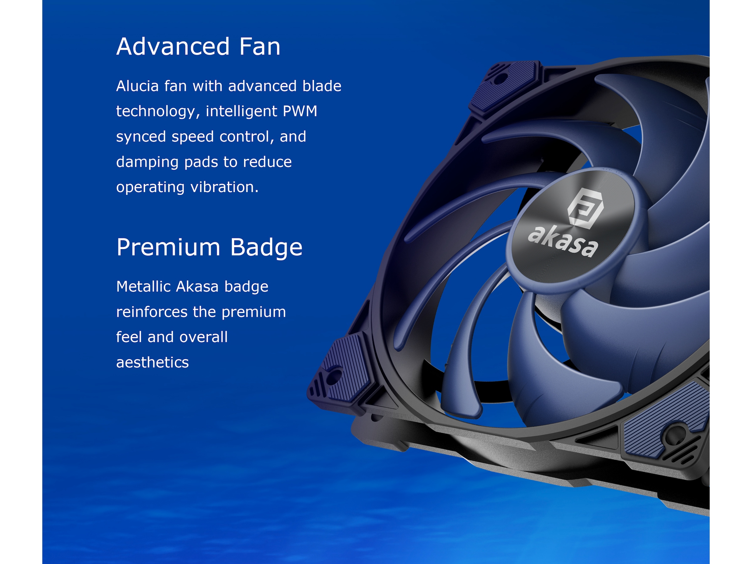 Alucia-vifte med avansert bladteknologi, intelligent PWM-synkronisert hastighetskontroll og dempende puter for å redusere vibrasjoner under drift. Premium BadgeMetallic Akasa-merket forsterker den førsteklasses følelsen og den totale estetikken