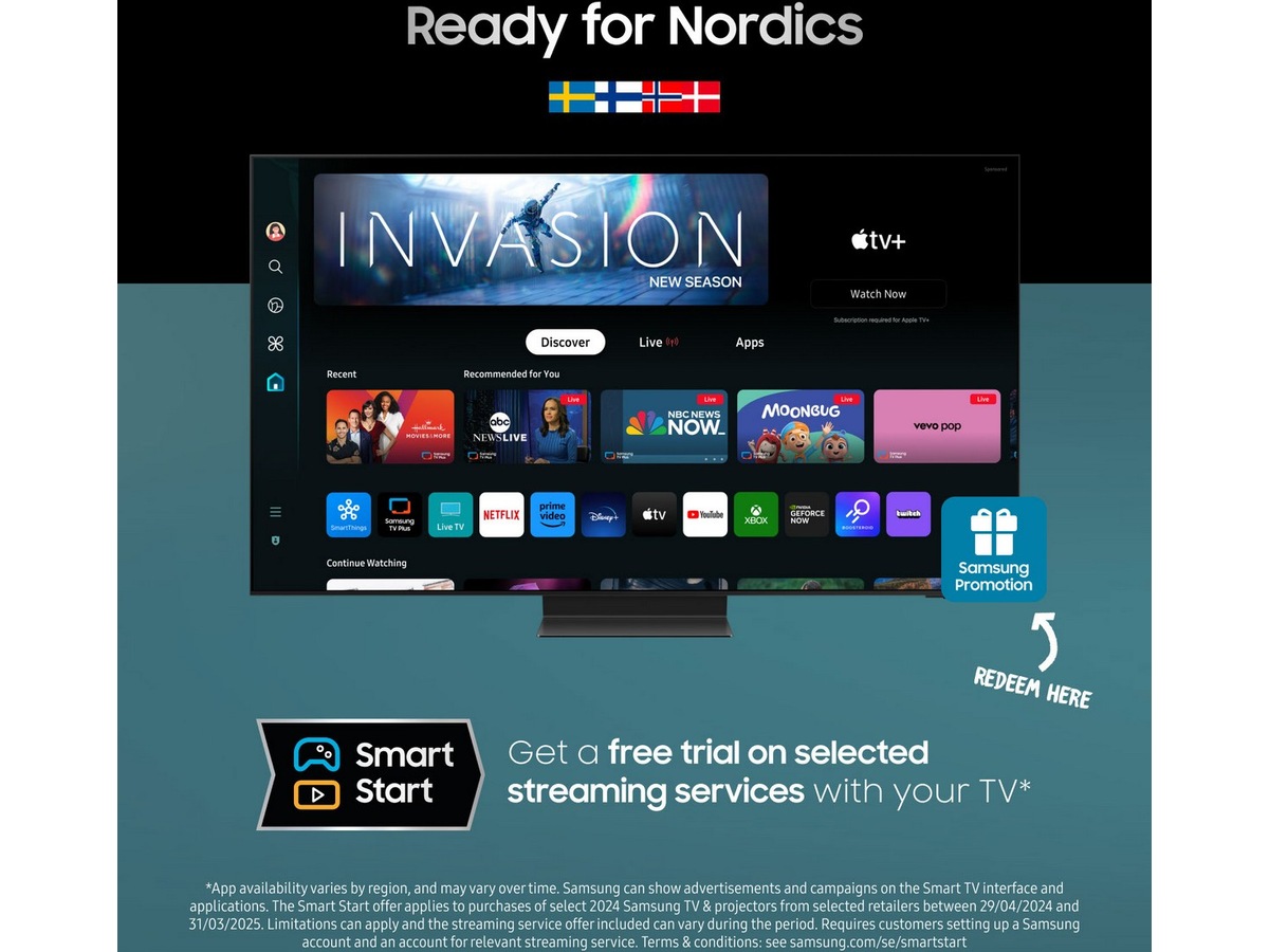 *Gjelder ved kjøp av utvalgte Samsung TV-er fra 2024 og utvalgte projektormodeller på samsung.com og hos utvalgte forhandlere i perioden 29.04.2024–31.03.2025. Underlagt begrensninger, og strømmetjenestetilbudene som inngår, kan variere i løpet av kampanjen. Krever Samsung-konto og at kunden oppretter konto hos den aktuelle strømmetjenesten. Vilkår: samsung.com/no/smartstart