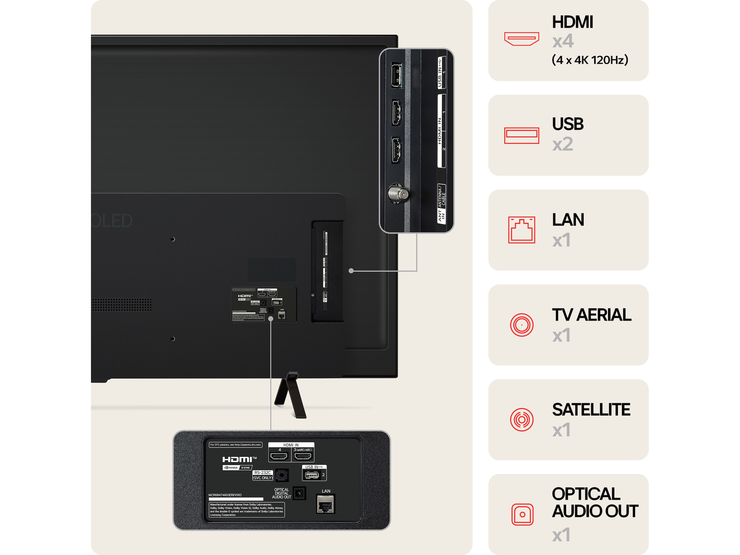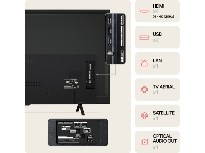| Egenskaper | AI Brightness Control, Always Ready, Freesync, AI Picture Wizard, Cloud Gaming, 4K High Frame Rate (HFR), Støtte for Apple AirPlay 2, Family Settings, AI Genre Selection, Støtte for USB-nettkamera, AI Concierge, Game Dashboard, G-SYNC Compatible |