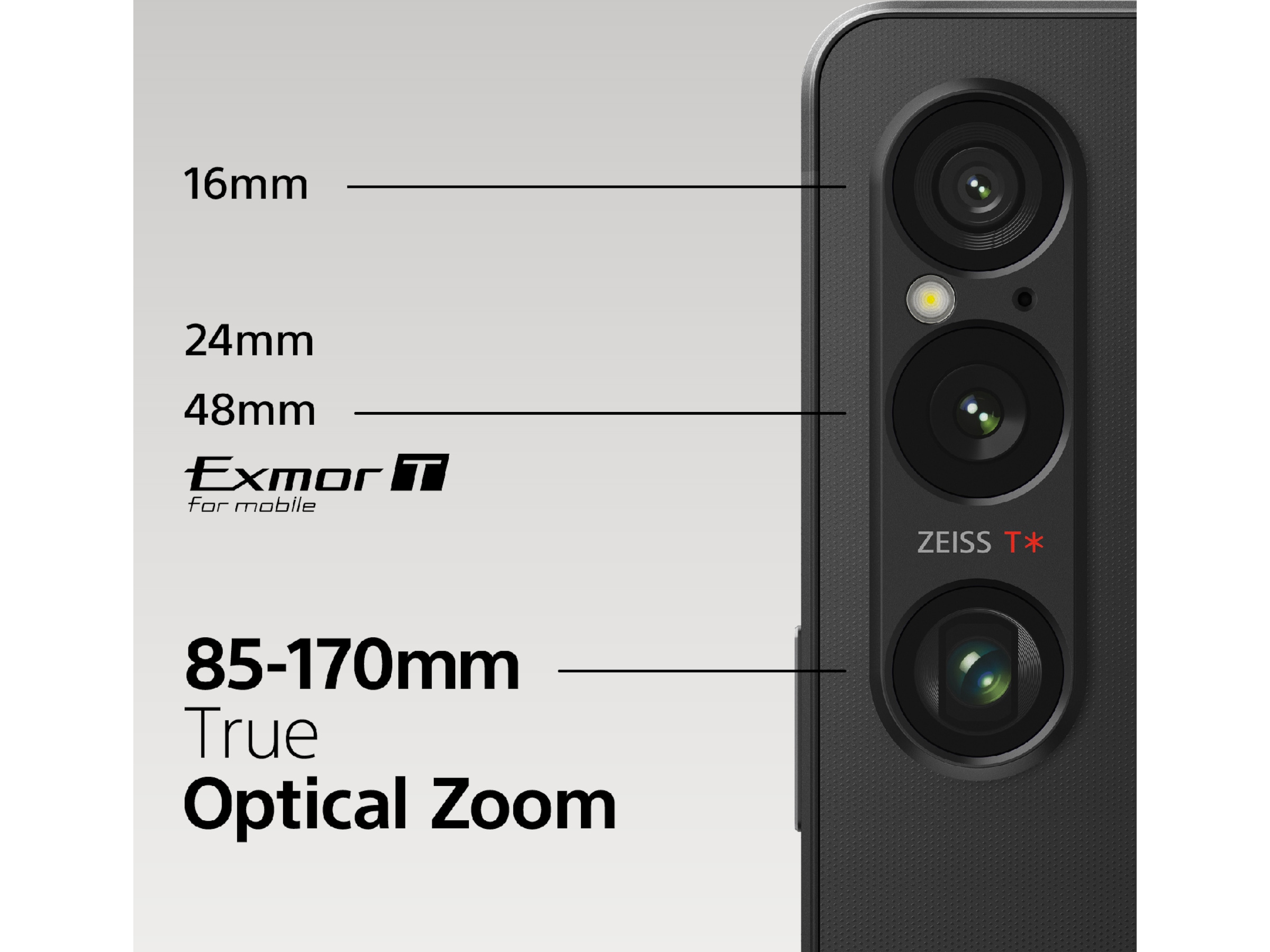 Det nye, utvidede 85-170 mm optiske teleobjektivet gir en ekte optisk zoom (3,5 til 7,1x ekvivalent) for uforringede bilder ved alle brennvidder. Kombinert med optisk stabilisering og Real-time Eye AF og sporing*2 er denne Sony-mobiltelefonen ideell for portretter.
