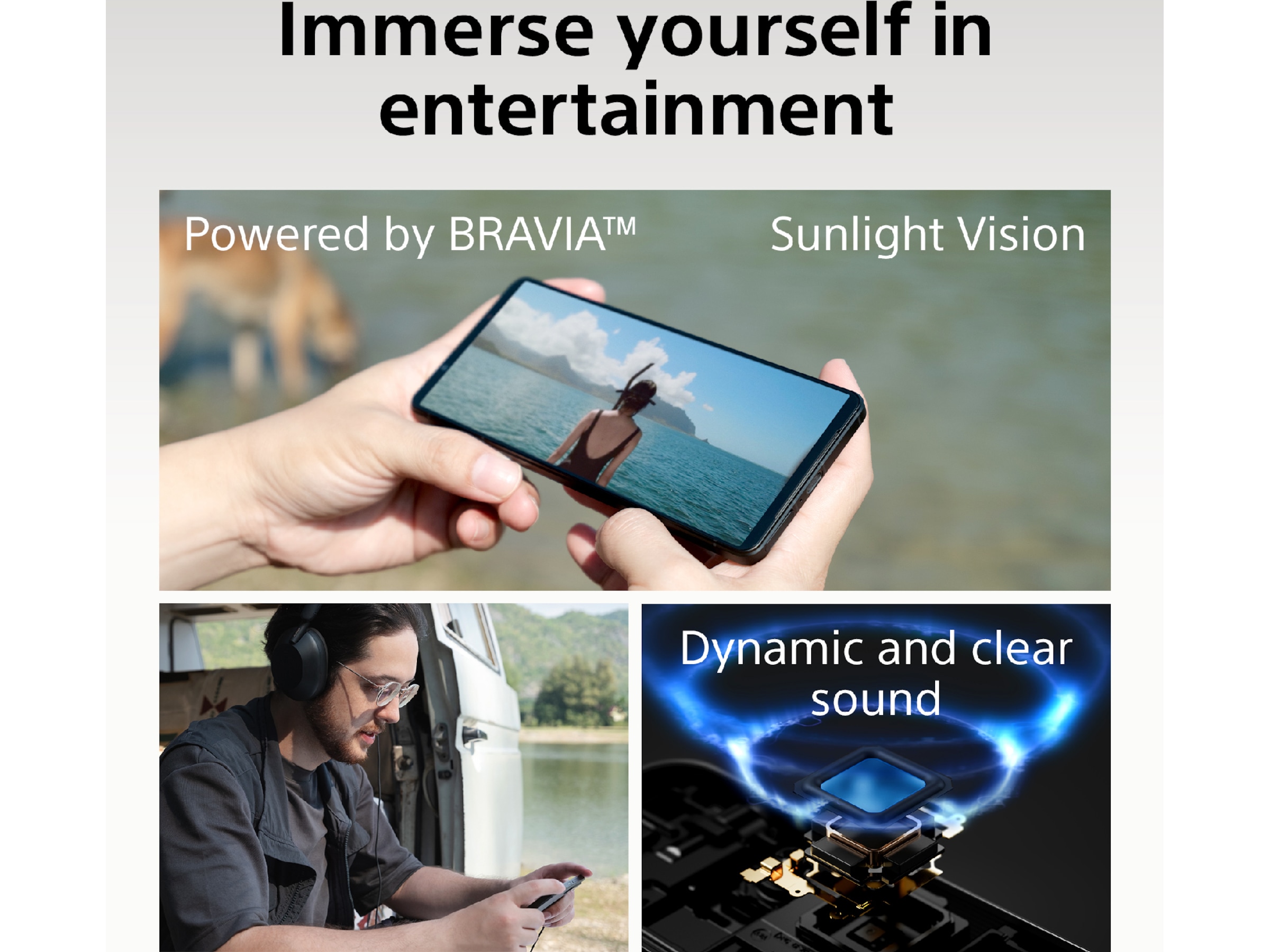 Med en ny Premium Audio Circuit for 3,5 mm kablede hodetelefoner, en ny høyttaler med høyere ytelse og innovative lydteknologier gir Xperia 1 VI all musikken din den plassen, klarheten og kvaliteten den fortjener, via kablede eller trådløse hodetelefoner eller Full-stage stereohøyttalerne.