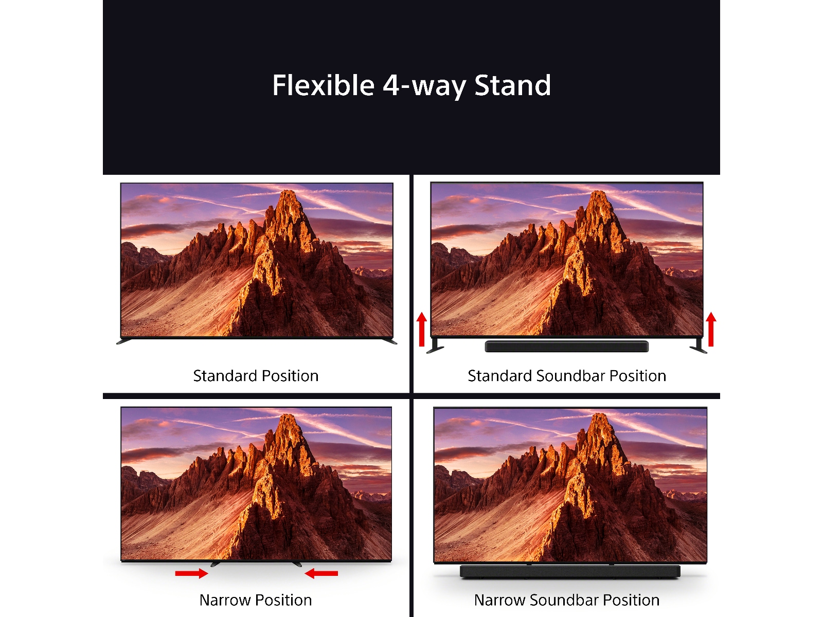 | Størrelses- og vektdetaljer | Panel med stativ (smal posisjon) - 166.7 cm x 39.7 cm x 97.2 cm x 45 kg, Panel med stativ og lydplanke - 166.7 cm x 39.7 cm x 103.4 cm x 45 kg, Panel uten stativ - 166.7 cm x 4.8 cm x 96 cm x 42.3 kg, Dimensjoner mellom støtteføttene - 165.7 cm |