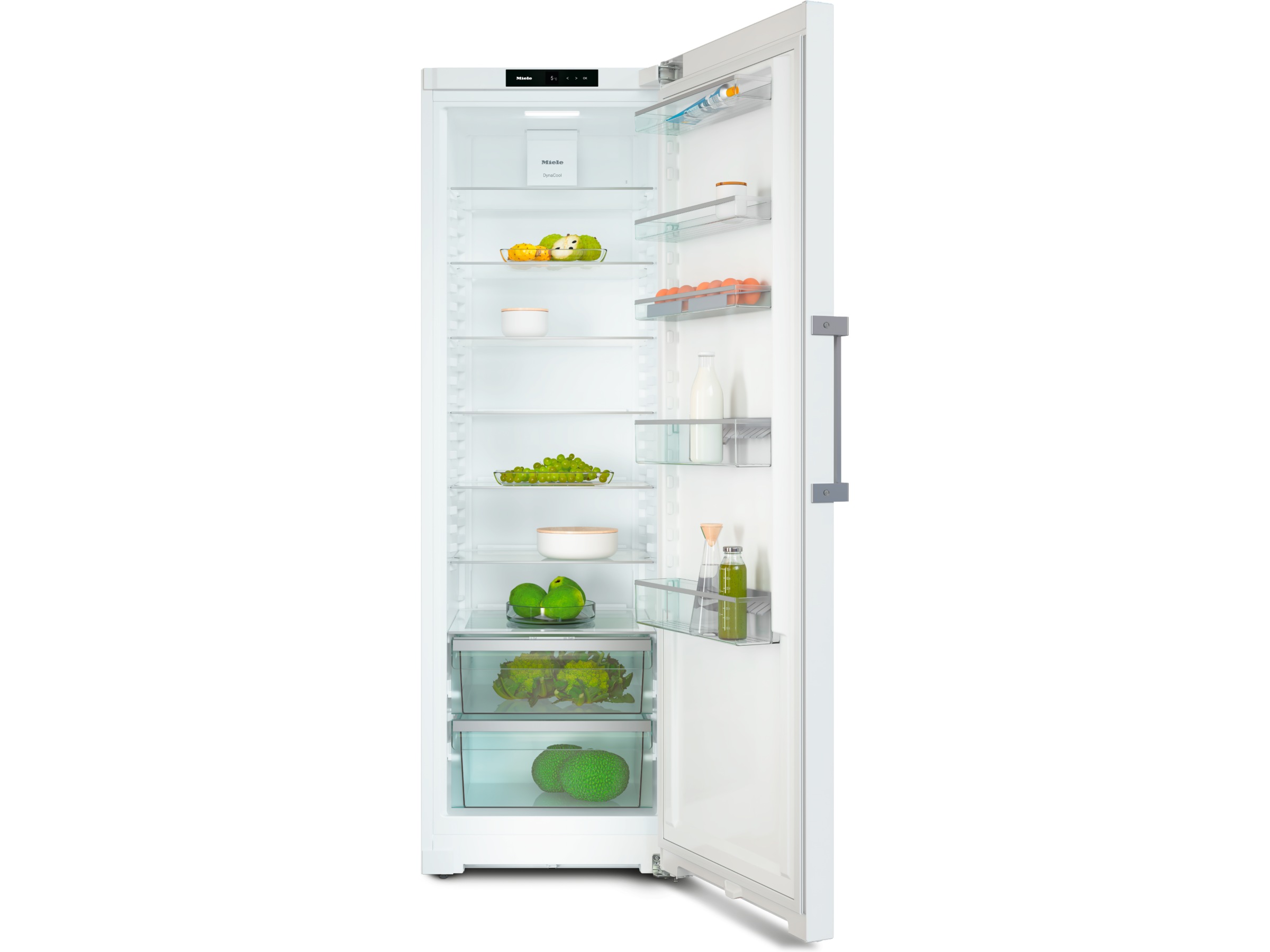 DynaCool-funksjonen sørger for jevn temperaturfordeling i hele kjølerommet. Dette gjør at det ikke lenger spiller noen rolle hvilken hylle matvarene lagres på, ettersom det er samme betingelser overalt. Regelen om at det er varmere oppe og kaldere nede er nå historie takket være DynaCool.