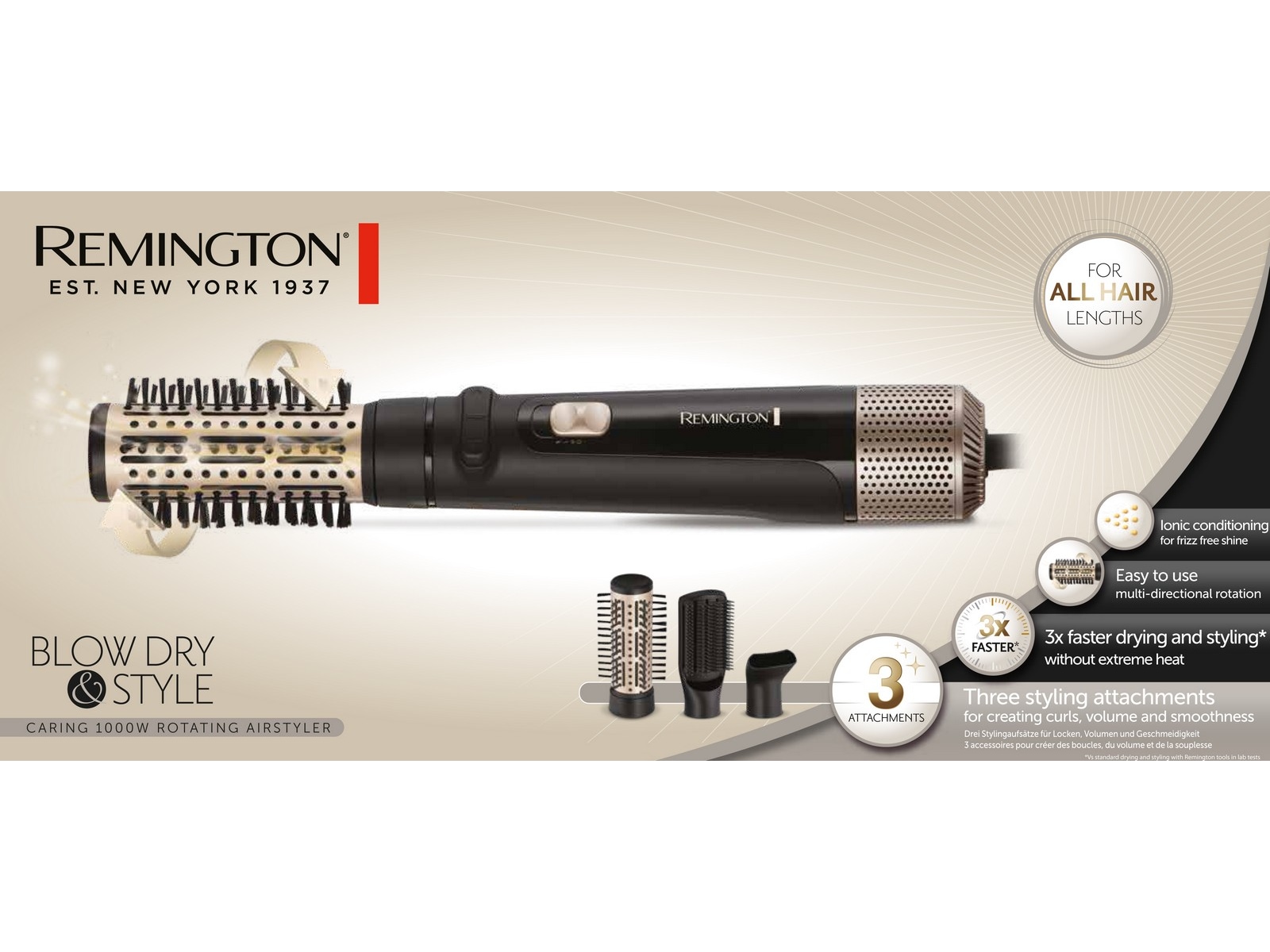 Airstylerens sterke luftstrøm er drevet av 1000 W og hjelper deg med å oppnå 3 ganger raskere* resultater, slik at du kan lage ditt utseende med ett stylingverktøy.