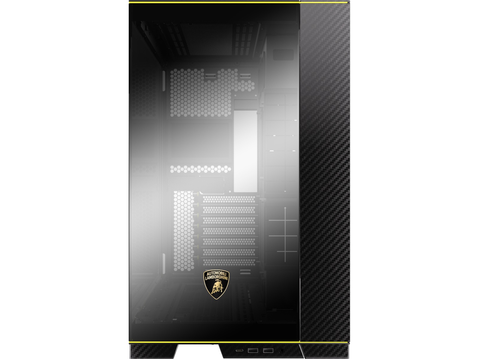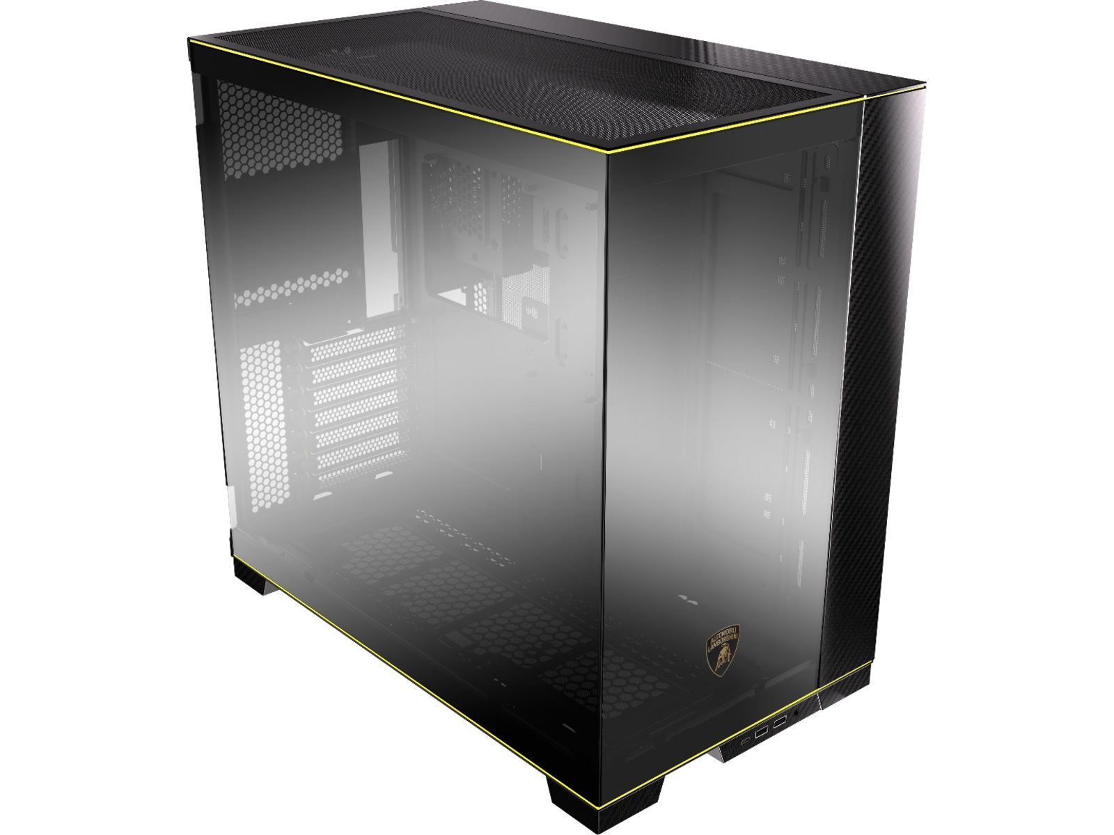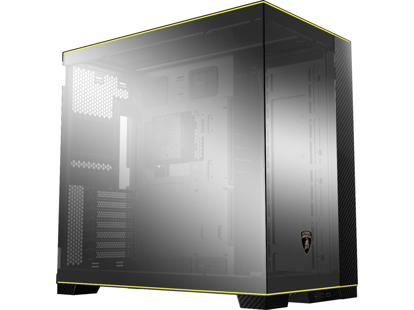 Ånden til Automobili Lamborghini er nedfelt i LIAN LI O11D, understreket av den ikoniske Automobili Lamborghini-logoen trykt på glasspanelet i forkrommet speilfinish. Dette samarbeidet mellom de to merkene er gjenkjennelig umiddelbart