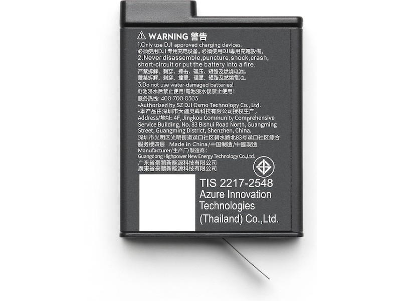 - Ladetiden ble målt under laboratorieforhold ved 25° C, mens du bruker DJI 30W USB-C Charger, med funksjonene for å ta bilder/videoopptak av og skjermene av. Brukstiden ble målt under laboratorieforhold ved 25 ° C, under opptak av 1080p/24fps (16:9) video, med RockSteady på, Wi-Fi av og skjermer av. Data ble samlet inn i et kontrollert miljø og skal kun brukes som referanse.